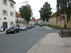 Die Straße Kreuz vom westlichen Ende aus gesehen, quer parkende Fahrzeuge auf dem Standort der einstigen Hinrichtungsstätte „Rabenstein“ (2012)