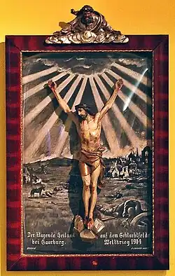 „In der Schlacht von SAARBURG, 20. August 1914, wurde dieses Christusbild wunderbarerweise erhalten, während der Kreuzesstamm weggeschossen wurde. Ich bin die Auferstehung und das Leben. Joh. 11, 25“