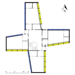 Wenn es das jeweilige Grundstück erlaubte, wurde der Kreuzbau immer unter maximaler Nutzung des Sonnenlichtes aufgestellt: Die Hauptfensterwand von Ost- und Westflügel weist nach Süden, während sie bei Nord- und Südflügel nach Osten weist. Somit ergibt sich bei Ansicht zweier Flügel eine charakteristische Abfolge von Haupt- und Nebenfensterwand, aus der sich die Himmelsrichtung des jeweiligen Flügels ergibt.