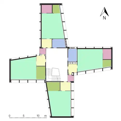 Der Grundriss des Kreuzbaus ist nicht spiegelsymmetrisch. Die Form des Kreuzbau-Grundrisses wird manchmal mit den Flügeln einer Windmühle verglichen, weil die Flächen der Flügel gegenüber dem Drehmittelpunkt seitlich verschoben sind. Jedoch ist der Grundriss des Kreuzbaus im Gegensatz zur Windmühle auch nicht rotationssymmetrisch, weil die Flügel nicht gleich lang sind. Dies ergibt sich daraus, dass die Flügel unterschiedlich stark in den Grundriss des Treppenhauses „hineingeschoben“ sind, weil nur zwei Flügel die WC-Räume und Not-Treppenhäuser aufnehmen und entsprechend länger sind. In der üblichen Aufstellung ragt der Nordflügel mit etwa 17 m am weitesten aus dem Bau hervor, während der kürzeste Flügel mit etwa 12 m entweder der Westflügel (rechts verjüngte Variante) oder der Ostflügel (links verjüngte Variante) ist.