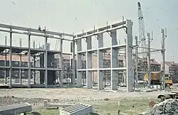 Die Montage des Kreuzbaus erfolgte mittels eines Hilfsgerüstes, das über zwei Stockwerke reichte. Dieses Gerüst wurde genau ausgerichtet und diente als Lehrgerüst zur vorläufigen Befestigung der Stahlbetonstützen und Wandteile sowie zur Auflagerung der Deckenplatten.[11] Die größten Bauteile waren die 10,7 m langen vertikalen Hauptstützen, die alle drei Geschosse durchlaufen. Die Decken sind als Plattenbalken ausgeführt, wobei zwei bis vier Hauptrippen (Stege) die Last abführen. Aus den Hauptstützen ragen Anschluss-Stähle nach innen, an denen ein Randbalken aus Ortbeton befestigt wird, der die Hauptstützen mit den Decken verbindet. Nachdem das innere Eckteil montiert war, besaß der Bau genug Stabilität gegen Verwindungen und das Hilfsgerüst wurde entfernt.[7]