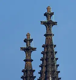 Im Winter 1880/81 wurden Holzgehäuse um die Kreuzblumen montiert, um den Arbeitern in der Kälte einen beheizten Arbeitsraum zu schaffen. 40 Steinmetze arbeiteten bis zum 12. Februar 1881 daran, die Blattkränze nachträglich filigraner zu gestalten.