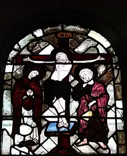 Das Kreuzigungsfenster in der mittleren Fensteröffnung des Chors hat eine Größe von 142 mal 58 cm. Es ist zweiteilig und besteht im unteren Teil aus weißem Stabwerk mit kleinen gelben und rotvioletten Quadern im Hintergrund, die die Freiräume der verschlungenen Bänder ausfüllen. Im oberen Rundbogenfeld befindet sich die Kreuzigungsgruppe, die in eine weiße Verglasung eingefügt ist. Das Fenster, das in das Ende des 13. Jahrhunderts datiert wird, stammt aus einer unbekannten Werkstatt.