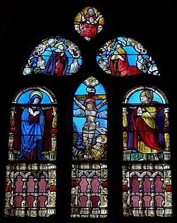 Das zentrale Fenster im Chor wurde von einer unbekannten Werkstatt geschaffen. Es zeigt auf drei Lanzetten eine Kreuzigungsszene mit der Kreuzigung Jesu, links daneben steht Maria und rechts der Apostel Johannes.