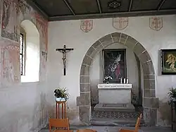 Das eine Kreuzigungsszene darstellende Ölgemälde über dem Altar ist die Kopie des im späten 20. Jahrhundert gestohlenen Originals.