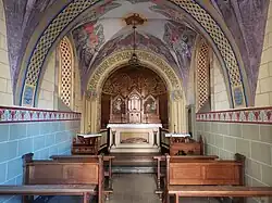 Der Altar zeigt verschiedene Darstellungen Christi: das Ereignis am Ölberg, die Grablegung und die Auferstehung Jesu Christi. Die Deckenmalerei stellt Christus mit einer Engelschar dar. In den Seitenschiffen sind bildliche Darstellungen zur Kreuzauffindung und zur Kreuzerhöhung zu sehen.[1]