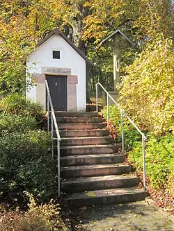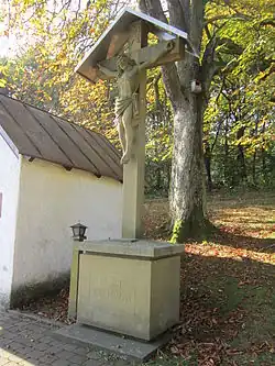 Das Tischsockelkreuz aus gelbem Sandstein neben der Kapelle wurde im Jahr 1960 vom Stralsbacher Bildhauer Rudolf Rost errichtet. Es ersetzte ein Kreuz unbekannter Entstehungszeit an gleicher Stelle, das wegen zu starker Verwitterung nicht mehr erhalten werden konnte. Das vier Meter hohe Kreuz ist im Nazarenerstil gehalten; der Sockel trägt in lateinischen Großbuchstaben die Aufschrift „Es ist vollbracht“.