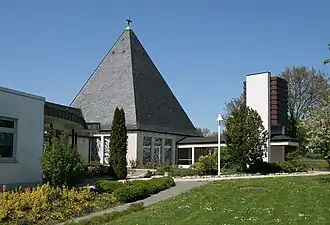Die Kirche hat ein regelmäßiges Fünfeck zum Grundriss und fasst 150 Personen. Prägendes Gestaltungselement ist ein Zeltdach, das die Höhe des Glockenträgers vor dem Eingang noch übertrifft. Seitlich angebaut wurden die Sakristei und Gemeinderäume.