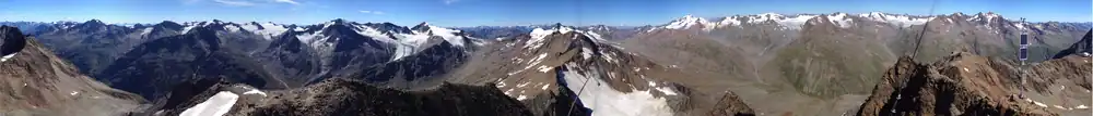 Kreuzspitze (ganz links) vom ca. 2,5 km südwestlich gelegenen Saykogel aus gesehen. Rechts unten die Martin-Busch-Hütte, etwa in Bildmitte der Brizzi-(auch Samoar-)See. -