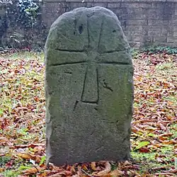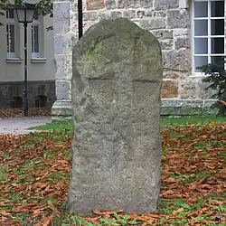 Der mittlere der fünf auf dem Kirchhof platzierten Kreuzsteine ist ein 90 cm hoher und 65 cm breiter Sandstein mit einer Dicke von 20 cm.[8]