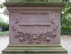 - ↑ Die Inschrift ist hier im Zustand des Jahres 2014 wiedergegeben. Beschädigte Textstellen am Denkmal sind im Zitat durch eckige Klammern gekennzeichnet. Die Interpunktion der Vorlage wurde übernommen.