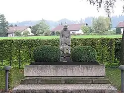 Das Kriegerdenkmal in Heiligkreuz, einem Pfarrdorf der kreisfreien Stadt Kempten, steht nach zahlreichen Versetzungen auf dem Ortsfriedhof.