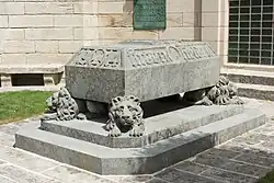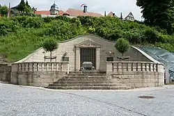 Die Gedenkstätte besitzt die Form eines halboffenen Ovals, das mit Futtermauern in den ansteigenden Hang eingefügt ist. In der Mitte steht ein Sarkophag, der von vier auf einem flachen Podest liegenden Löwen getragen wird.[1] An der Wand hinter dem Sarkophag sind Metalltafeln mit den Namen und den Sterbedaten der Gefallenen des Ersten Weltkrieges angebracht. Links und rechts der Wand mit den Namenstafeln ist je eine steinerne Büste eines behelmten Soldaten an der Steinmauer befestigt.