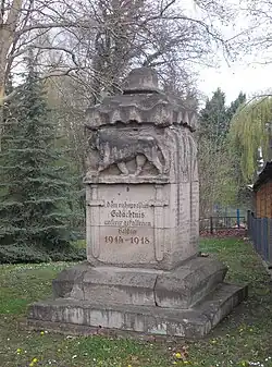 Das Kriegerdenkmal wurde für die Gefallenen des Ersten Weltkriegs errichtet. Es handelt sich um eine Stele, die von einem Stahlhelm gekrönt ist. Darunter befindet sich ein schreitender Löwe und die Inschrift Dem ruhmvollen Gedächtnis unserer gefallenen Helden 1914 - 1918. Die Inschrift wird an den Seiten von zwei nach unten gerichteten Schwertern begrenzt. Die Inschrift auf der Rückseite ist nur noch teilweise erhalten, da ein Teil gewaltsam entfernt wurde. Sie lautet (Teil entfernt) Und diese Tat habt Ihr mit Eurem Tod besiegelt. Auf den Seiten der Stele sind die Namen der Gefallenen eingetragen, manche aber aufgrund der Verwitterung sind nicht mehr lesbar.