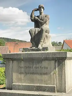 Ein weiteres Denkmal – ein auf einem Sockel sitzender Krieger aus Freyburger Kalkstein – schufen 1925 Josef Heise aus Weimar und Franz P. Otto Heidelmann aus Stadtsulza. Die jetzige Widmung ist jedoch nicht die originale.[2][3][4] Heise schuf die Figur, Heidelmann den Sockel.
