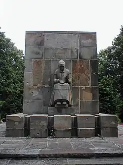 Auf der Rückseite zeigt das Monument eine Mutter, die um ihren Sohn trauert. Hinter ihr sind deutsche Soldaten zu sehen, die mit Handgranaten und Gewehren angreifen.