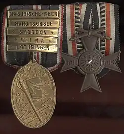 Im Zentrum der kaiserliche Reichsadler mit Krone, dessen Mittelschild diagonal schwarz/weiß/rot emailliert ist. Das Zentrum ist von einem schmalen Eichenlaubkranz eingefasst. Auf den beiden waagerechten Kreuzarmen die Jahreszahlen (links) 1914; (rechts) 1918. Bei den Kämpferkreuzen sind oben, unterhalb des Trageringes, zwei gekreuzte Schwerter aufgesetzt.