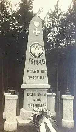 Wie die Franzosen bereits zuvor, planten auch die Russen ihren verstorbenen Gefangenen mit einem Denkmal zu gedenken. Ein Obelisk aus Granit, 4 Meter hoch und mit einer Grundfläche von 1,4 × 1,4 Meter war mit Inschriften in deutscher und russischer Sprache versehen. Vier kleinere Granitsäulen umgeben das Denkmal. Ein Georgskreuz, ein Medaillon mit Doppeladler und Zarenkrone schmücken das Denkmal. Der französische Gefangene Dehaye hat diesen Obelisk, wie zuvor bereits den französischen, geschaffen. Am 22. März 1916 erfolgte auf dem Kriegsgefangenenfriedhof die feierliche Weihe nach streng orthodoxem Ritual. In Anwesenheit der russischen Gefangenen, Angehörigen der Wachmannschaften und einer Abordnung der Kommandantur sowie des Kommandanten des Truppenübungsplatzes Generalmajor Stark und des Kommandanten des Kriegsgefangenenlagers Lange erfolgten die Feierlichkeiten.[2]