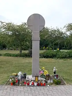 Nicht weit davon entfernt, auf dem neuen Teil des Friedhofs, steht ein hohes, weißes Friedhofskreuz in Form einer Gedenkstele mit Sonnenrad.[8] Um dessen Fries ist ein Stacheldrahtmuster eingemeißelt, als Symbol für das Lager und zum Gedenken an die namenlos und unbekannt Begrabenen. Es wurde 2007 von dem Rheinberger Steinmetz Dieter Knop angefertigt. Die Finanzierung dafür übernahmen sowohl die katholische als auch die evangelische Gemeinde. Bei einem ökumenischen Gottesdienst wurde es eingeweiht.