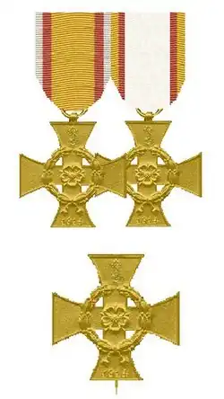 Für Kriegsverdienste ist das Ordensband goldgelb mit je einem roten und weißen Seitenstreifen, für Heimatverdienst weiß mit roten und goldgelben Seitenstreifen.