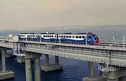 Die offizielle Inbetriebnahme der Eisenbahnstrecke erfolgte am 23. Dezember 2019 durch eine Eröffnungsfahrt mit Putin im Führerstand eines Diesel-Regionalverkehrszuges über die Brücke.[31][32] Zuvor fuhr Ende September ein erster Dieseltriebwagen mit Journalisten an Bord zu Testzwecken über die Brücke.[33] Das rollende Material dieser Zugverbindung stellt anstelle der staatlichen Eisenbahngesellschaft der Anbieter Grand Serwis Express,[34] da die Staatsbahn RŽD das Risiko von Sanktionen im internationalen Verkehr nicht eingehen wollte.[35] Die neuen Züge brauchen von St. Petersburg nach Sewastopol etwa 45 Stunden – über 9 Stunden länger als die 2014 eingestellten Verbindungen durch die Ukraine. Zu Beginn wurde die neue Krim-Brücke in beiden Richtungen mitten in der Nacht passiert. Dem privaten Bahnunternehmen fehlten Züge, um die Strecke öfter zu bedienen.[36] Der zweigleisige Ausbau der Strecke war zum Zeitpunkt der Eröffnung noch nicht abgeschlossen.[37][38]