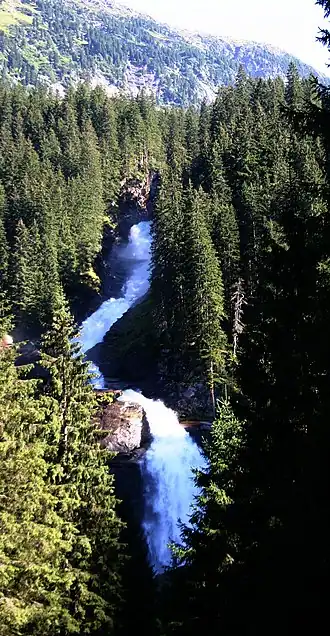 Die Krimmler Wasserfälle sind mit einer gesamten Fallhöhe von 380 m[1] die höchsten Wasserfälle Österreichs. Sie befinden sich am Rand des Ortes Krimml (Salzburger Land) im Nationalpark Hohe Tauern. Gebildet werden sie durch die Krimmler Ache, die am Ende des hoch gelegenen Krimmler Achentals in drei Fallstufen hinunterstürzt. Das Wasser fließt dann in die Salzach, den Pinzgau entlang weiter Richtung Salzburg und gelangt zur Mündung in den Inn.