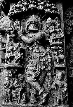 Flöte spielender Gott Krishna (venugopala) am Hoysala-Tempel von Somanathapura, Karnataka; in der Randzone Gopis und Kühe
