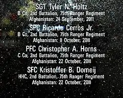 - ↑ a b c Elizabeth Flock: Army Ranger Kristoffer Domeij killed in action on 14th deployment, Artikel vom 27. Oktober 2011 in The Washington Post, abgerufen am 3. Dezember 2011.