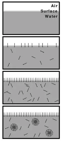 Bei einer Konzentration von oberflächenaktiven Substanzen (wie Tensiden) unterhalb der CMC bewegen sich die Moleküle frei und einzeln (als Monomer) in der Flüssigkeit und positionieren sich bevorzugt mit ihrem hydrophoben Molekülteil an der freien Oberfläche. Bei Konzentrationen unterhalb der CMC nimmt die Oberflächenspannung der Flüssigkeit mit steigender Konzentration der Tenside ab.