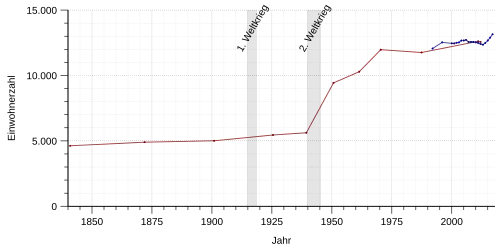 | Zwischen 1988 und 2008 wuchs die Einwohnerzahl um 932 bzw. 8 %. Zwischen 1988 und 2018 wuchs die Stadt von 11.632 auf 13.293 um 1661 Einwohner bzw. um 14,3 %. | ![]() |