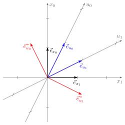 Die natürlichen Basisvektoren zeigen ein sehr einfaches Transformationsverhalten. Für die normierten Basisvektoren enthält die Transformationsformel zusätzliche Faktoren :
