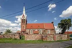 - Die römisch-katholische Kirche Unsere Liebe Frau vom Rosenkranz (poln. Kościół Matki Bożej Różańcowej) entstand bereits in der ersten Hälfte des 13. Jahrhunderts im gotischen Stil. Erstmals erwähnt wird die Kirche im Jahr 1325. In den folgenden Jahrhunderten wurde der Bau mehrfach erweitert. 1900 wurde der Glockenturm errichtet. Umgeben ist der Kirchenbau von einer steinernen Mauer aus dem 16. Jahrhundert.[5] Die Kirche steht seit 1964 unter Denkmalschutz.[6]