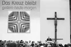 Während der Zeit des Nationalsozialismus gab es in Deutschland heftige Proteste gegen Versuche des NS-Regimes, Kreuze und Kruzifixe aus öffentlichen Einrichtungen zu entfernen. Insbesondere im Oldenburger Münsterland kam es 1936 als Reaktion auf den zuvor ergangenen Kreuzerlass zum sogenannten Kreuzkampf, in dessen Verlauf der damalige Bischof von Münster, Clemens August Graf von Galen, die Gläubigen in Hirtenbriefen[15] zum Widerstand gegen die Entfernung von Kreuzen und Kruzifixen durch die Beauftragten des Gauleiters Carl Röver aufforderte. Letztlich verblieben die christlichen Symbole im öffentlichen Raum. 1938 ließ der thüringische Gauleiter Fritz Sauckel das Kreuz auf dem Bergfried der Wartburg durch ein Hakenkreuz ersetzen. Proteste aus der Bevölkerung führten jedoch dazu, dass es bereits nach einem Monat wieder entfernt wurde und das christliche Kreuz wieder an seine Stelle kam.[16] Ähnlich erfolgreich war 1941 der Kampf bayerischer Katholiken gegen eine Anordnung von Gauleiter Adolf Wagner, Kruzifixe aus bayerischen Klassenzimmern zu entfernen und durch „zeitgemäßen Wandschmuck“ zu ersetzen.[17]