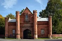 - Neogotisches Torgebäude des Schlosses im Tudorstil aus dem Jahr 1856 mit roter Ziegelfassade