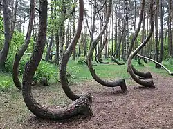 Der Name „Krummer Wald“ geht auf ursprünglich etwa 400 deformierte Kiefern zurück. Diese Bäume sind ca. 40 cm über dem Erdboden um 90° gekrümmt, die Krümmung verläuft etwa 1–3 m, danach wachsen die Bäume wieder gerade nach oben. Aufgrund dieser Wuchsform erinnern die Bäume an auf dem Kopf stehende Fragezeichen. Aufgrund Schädlingsbefall und anderen zerstörenden Ereignissen stehen aktuell noch etwa 100 dieser Nadelbäume. Die Kiefern selbst sind zwischen 11 und 15 m hoch, das Alter des Waldes wird auf etwa 70 bis 80 Jahre geschätzt. Er wurde in den späten 1930er Jahren gepflanzt, als die ehemalige Provinz Pommern noch zu Deutschland gehörte.