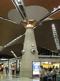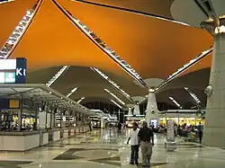 Die Dachkonstruktion im Hauptabfertigungsgebäude besteht aus 39 gleichen quadratischen Dacheinheiten, welche abgewandelte Formen von Zeltdächern sind. Jede Dacheinheit besteht aus zwei miteinander verbundenen Schalen, einem sogenannten hyperbolischen Paraboloiden. Diese Schalen werden durch vier Stahlstützen stabilisiert, welche gleichzeitig die Dachgrate bilden. Jede dieser vier Stahlstützen besteht aus drei auseinander- und wieder zusammendriftenden Stahlrohren, zwischen denen Licht in die Check-in-Halle einfluten kann. Die Stahlstützen ruhen auf vier mit Granit verschalten konischen Säulen und laufen in der Dachspitze zusammen. An den Verbindungen (Kapitelle) zwischen Säulen und Stahlstützen beleuchten Lampen die Decke, welche mit Holzimitaten verkleidet ist. Anstatt die Last der Dachkonstruktion auf die konischen Säulen zu übertragen, hätte sich das Architektenteam auch dazu entscheiden können, die Konstruktion durch Zugglieder zwischen den Säulenkapitellen zu stabilisieren. Ein großer Vorteil der konischen Säulen besteht jedoch darin, dass sie im Innern genug Platz haben, um Regen- und Belüftungsrohre und andere Leitungen aufzunehmen. Die Dachkonstruktion soll laut Kurokawa Elemente der malaysischen Architektur verdeutlichen, sich an den islamischen Hintergrund des Landes anlehnen und außerdem die Fortschrittlichkeit und Modernität des südostasiatischen Staates symbolisieren.