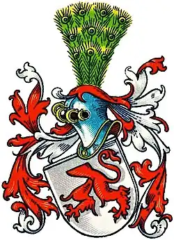 Blasonierung: In Silber die untere Hälfte eines aufgerichteten roten Löwen. Auf dem gekrönten Helm ein grüner Pfauenschweif. Die Helmdecken sind rot-silbern.[7]