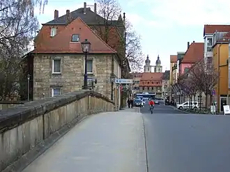 In Höhe der Einmündung der Straße Kreuz wurde 1410 erstmals eine Kapelle zum Heiligen Kreuz erwähnt,[9] die dem Stadtteil Kreuz den Namen gab. Das folgende Gebiet, auf dem sich rechts der Straße im 19. Jahrhundert zwei Brauereien ansiedelten, wird auch als „Herzog“ bezeichnet. Dort geht in Höhe der Kulmbacher Straße 56 die gleichnamige Straße ab.