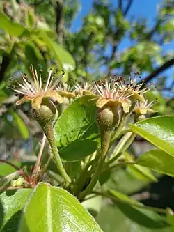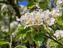 Pyrus communis ist vorweiblich protogyn.[6][7][8] Die stark riechenden Blüten stehen in wenigblütigen, doldentraubigen Blütenständen zusammen.[3] Die gestielten, zwittrigen, radiärsymmetrischen und fünfzähligen Blüten weisen einen Durchmesser von 2 bis 3 Zentimeter auf. Die Blütenstiele sind behaart bis kahl.[9] Es ist ein kahler bis behaarter Blütenbecher vorhanden. Der Kelch ist meist beidseits filzig behaart. Die fünf meist weißen und kurz genagelten Kronblätter werden etwa 2 bis 5 Zentimeter lang. Die Staubbeutel der bis zu 30 relativ kurzen Staubblätter sind meist rot. Der fünfkammerige Fruchtknoten ist unterständig mit meist fünf freien, an der Basis behaarten Griffeln. Die Staubblätter sind anfangs nach innen gekrümmt und biegen sich dann nach außen, die anfangs genäherten Griffel spreizen sich später auseinander.[10] Es sind jeweils Nektarien vorhanden.[8] Blütezeit ist je nach Sorte April und Mai. Die Blüten werden durch Insekten bestäubt und sind selten selbstfertil.