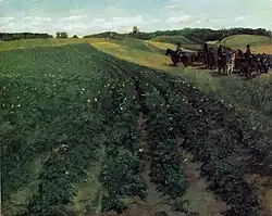 Wenn ein Maler das Leben der Armen abbilden wollte, wenn ein Schriftsteller eine bäuerliche Familie schilderte, waren ab dem 19. Jahrhundert Kartoffeln ein beliebtes Thema, um das einfache Leben zu beschreiben. Das Bild L’Angélus (Das Angelusläuten) von Jean-François Millet entstand 1855 und wurde etwa ab der Jahrhundertwende massenhaft reproduziert. Es zeigt eine Frau und einen Mann beim Gebet auf dem Feld; im Vordergrund steht ein gefüllter Korb mit frisch geernteten Kartoffeln, hinter dem Paar eine Schubkarre mit gefüllten Säcken.[23] Auch Vincent van Goghs Gemälde Die Kartoffelesser von 1885 ist weltbekannt. In der ersten Schaffensperiode von Max Liebermann entstand 1874 das Bild Kartoffelernte in Barbizon. Die Schönheit eines blühenden Kartoffelfeldes hat 1876 der deutsche Maler Wilhelm Trübner in seinem Gemälde Kartoffelacker in Weßling eingefangen. Als Teilnehmer an einer Schlacht erscheinen Kartoffeln auf Raoul Michaus surrealistischem Bild La Bataille des Pommes de Terre 1948.