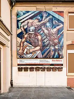 Direkt am Südflügel ist außen an der Fassade neben dem Haupteingang ein überdimensionales Gemälde angebracht, das Helden des Bergbaus zeigt: zwei muskulöse Bergleute teufen einen Schacht ab, ein anderer bedient die Schalttafel einer technischen Einrichtung. Das Bild ist ein Ausschnitt (untere linke Ecke) des 16 × 12 m großen Wandbildes Friedliche Nutzung der Kernenergie des Leipziger Künstlers Werner Petzold. Das Original hing zuerst am Gebäude des Bergbaubetriebes Paitzdorf und gelangte nach 1990 in den Landschaftspark Neue Landschaft in Thüringen[8]. Der hier in Bad Schlema aufgehängte passende Ausschnitt wurde 1974 mit Industrieemaille im Schilderwerk Beutha in 24 farbigen rechteckigen Einzelteilen hergestellt. Bei der Bemalung der Segmente unterstützten Kunsterziehungslehrer des Kreises Aue den Künstler.[9]