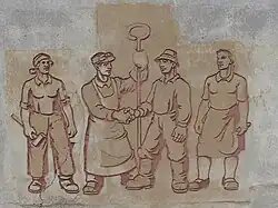 Das Kulturhaus wurde auf T-förmigem Grundriss als einfacher verputzter Ziegelbau ohne stilistische Elemente errichtet. Im Giebeldreieck über dem Haupteingang hatte man eine Figurengruppe mit der Darstellung der Verbundenheit von Arbeitern und Bauern in Sgraffitoputz eingearbeitet. Auch hier wurde bei der Darstellung Wert auf das Bündnis zwischen den Bauern und der Arbeiterklasse gelegt.
