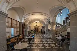 Das Gebäude wurde 1915–1921 nach Plänen der Winterthurer Architekten Bridler & Völki erstellt. Der neoklassizistische Walmdachbau verfügt über eine westliche Schaufassade mit mächtiger Säulenordnung, die auf der Ostseite wiederholt wird. Im zentralen Innenhof finden Veranstaltungen statt, darunter das St. Galler Kulturfestival.