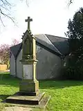 (1.3) Karte Gedenkkreuz von 1882 für die Eheleute Jodokus Bröhl und Klara Küster. Zwei höllandische Linden sind Begleitbäume (Naturdenkmal). Der Standort zeigt die Südseite der Allmende, des Gemeindeflures, an. Das Kreuz ist eine besonders sorgfältige bildhauerische Arbeit mit durchgearbeiteter Konsole, Profilen und Nischeneinfassung. In der Nische steht eine Muttergottesstatue.[3]