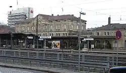Den historischen Bahnhof entwarf Eduard Rüber. Das Empfangsgebäude (Bahnhofplatz 9) wurde 1863/1864 über einem querrechteckigen Grundriss mit breitem Mittelrisalit errichtet. Die Längsseiten weisen neun, die Querseiten drei Achsen auf, dabei bestehen die Achsen an den Längsseiten zum Teil aus gekuppelten Doppelfenstern. Auf den Bahnsteigen sind zum Teil noch die ursprünglichen Überdachungen auf den gusseisernen Ständern erhalten.
