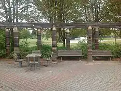 Die Pergola aus auf der Töpferscheibe gedrehten Elementen schafft einen Rahmen für die Sitzgelegenheiten auf dem kleinen Zwischenplateau. Nach den Vorstellungen der Projektentwickler sollte dieser „Verweilbereich“ mit einer „naturhaften, formgestalterisch originellen Lösung“ und mit „Elementen, die der Geselligkeit und Kommunikation förderlich sind“ ausgestattet sein und speziell von Jugendlichen genutzt werden.[11]