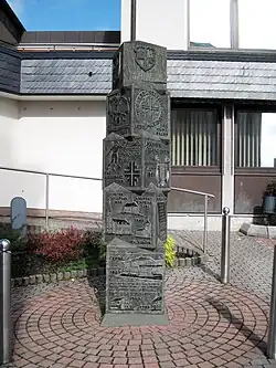 Auf fünf, versetzt übereinander angeordneten Quadern befinden sich Darstellungen aus der Geschichte Medebachs. | ||