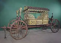 Aus der beachtlichen Sammlung höfischer Prunkwagen und Turnierschlitten stechen zwei reich dekorierte vergoldete Hochzeitskutschen der Renaissance hervor.[42] Der vergoldete Prunkwagen zur 1599 gefeierten Hochzeit von Herzog Johann Casimir mit Margarethe von Braunschweig Lüneburg, der schon 1561 bei der Hochzeit der Brauteltern verwendet wurde, ist der älteste noch fahrbereite Wagen seiner Art.[43]