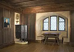 Auf der Veste Coburg haben sich bedeutende historische Räume erhalten, die die Schausammlungen des Museums ergänzen: Die „große Hofstube“, ein 1504 fertiggestellter Festsaal, zählt zu den größten Profanräumen ihrer Zeit und führt den Stellenwert der Veste als wichtige Nebenresidenz der sächsischen Kurfürsten vor Augen.[46] Von hier aus begleitete Martin Luther die konfessionspolitischen Verhandlungen auf dem Augsburger Reichstag, denen er als Geächteter nicht selbst beiwohnen durfte. Die vom Reformator bewohnten „Lutherzimmer“, die von Bodo Ebhard ab 1909 errichtete „Lutherkapelle“ sowie umfangreiche Sammlungsbestände zur Reformation unterstreichen die Bedeutung der Veste als Luthergedenkstätte.[6] Hervorzuheben ist ferner das 1632 vollendete „Jagdintarsienzimmer“, ein in Deutschland einmaliges Meisterwerk der Intarsiendekoration.[47] Ein Spätwerk des Burgenhistorismus sind die Wohnräume Herzog Carl Eduards und seiner Familie, die von Bodo Ebhardt mit modernem Wohnkomfort eingerichtet wurden und einen interessanten Kontrast zum Eindruck einer mittelalterlichen Burg bilden.[48]
