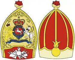 Musketiere[12] trugen einen schwarzen Dreispitz mit goldenem Besatzstreifen und einem Zweig Eichenlaub, drei roten Pompons und einer schwarzen Kokarde. Grenadiere trugen eine Grenadiermütze mit mittelgelber Vorderseite und gelben Verzierungen (gekrönter Schild mit springendem Ross im blauen Hosenbandorden über blauem Spruchband mit der Devise nec aspera terrent), sowie darunter einer roten, gelb gepaspelten Frontklappe mit Granate und Trophäen. Die Rückseite umfasste den roten Mützensack mit mittelgelbem Boden, alles mit gelbem Besatz verziert.